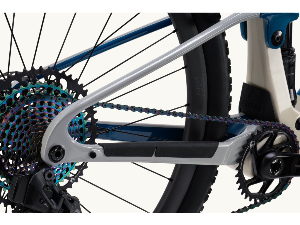 Co nejvíce do šířky osazené čepy a další navrhnutá řešení umožňují co nejjednodušší, nejlehčí a nejtužší řešení. Uchycení tlumiče pro LANDO XC z jednoho kusu lisovaného karbonu doplňuje zadní triangl, který je taktéž s jednoho kusu, při minimalizaci váhy a maximalizaci tuhosti, zatímco je eliminováno kroucení rámu.